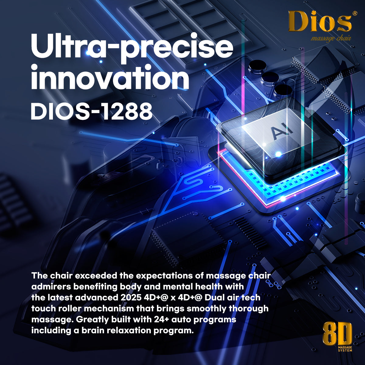 At the core of the Dios 1288 is the groundbreaking 2025 4D+@ and 4D+@ Dual Air Tech Touch roller mechanism. This advanced system delivers an unparalleled, deeply smooth massage experience, exceeding the capabilities of standard 4D chairs.